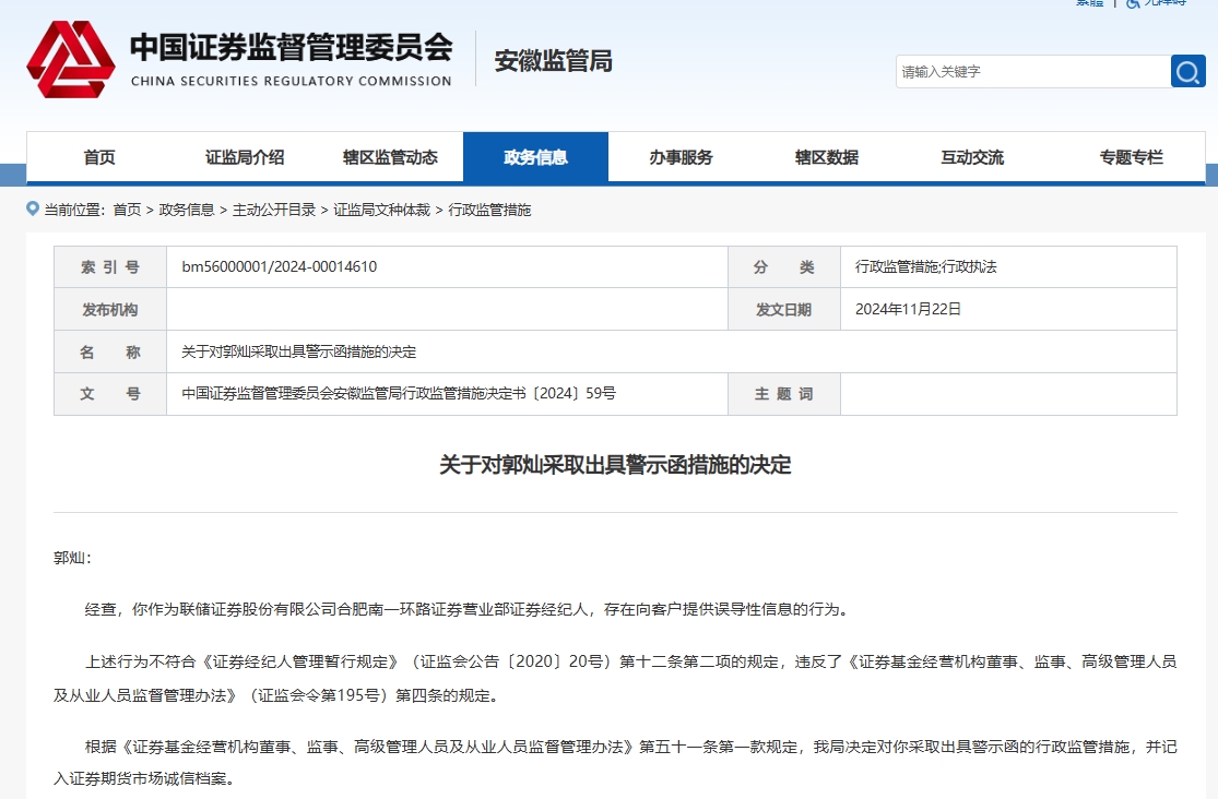 2024年11月22日,安徽證監(jiān)局披露了關(guān)于對(duì)聯(lián)儲(chǔ)證券郭燦采取出具警示函措施的決定。