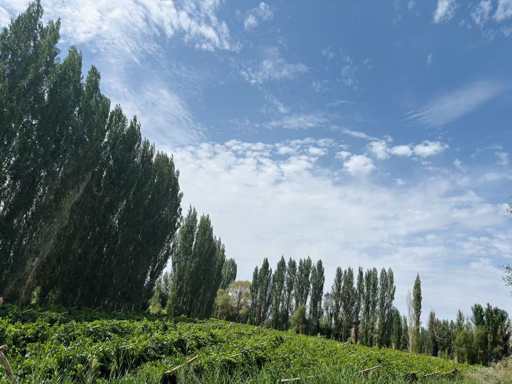 水畔綠洲,也滋養(yǎng)了人跡。葡萄藤蔓在沙土里堅(jiān)韌穿行,深深扎入地下,如綠洲的血管,汲取著生命的養(yǎng)分。藤蔓攀爬,綠葉如蓋,濃蔭遮蔽了驕陽,累累果實(shí)如珠玉懸垂。人們于藤架下?lián)]汗,在沙中種出甘甜。葡萄在枝頭漸熟,那甜意不僅是舌尖滋味,更是綠洲對耕耘者的無言饋贈——干渴大地竟能結(jié)出如此清潤之實(shí),其中自有造化的神奇。