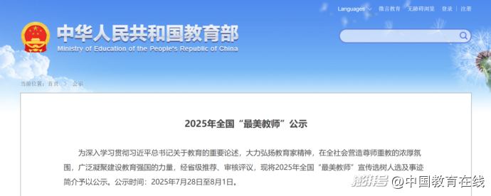 7月28日,教育部發(fā)布了《2025年全國“最美教師”公示》。