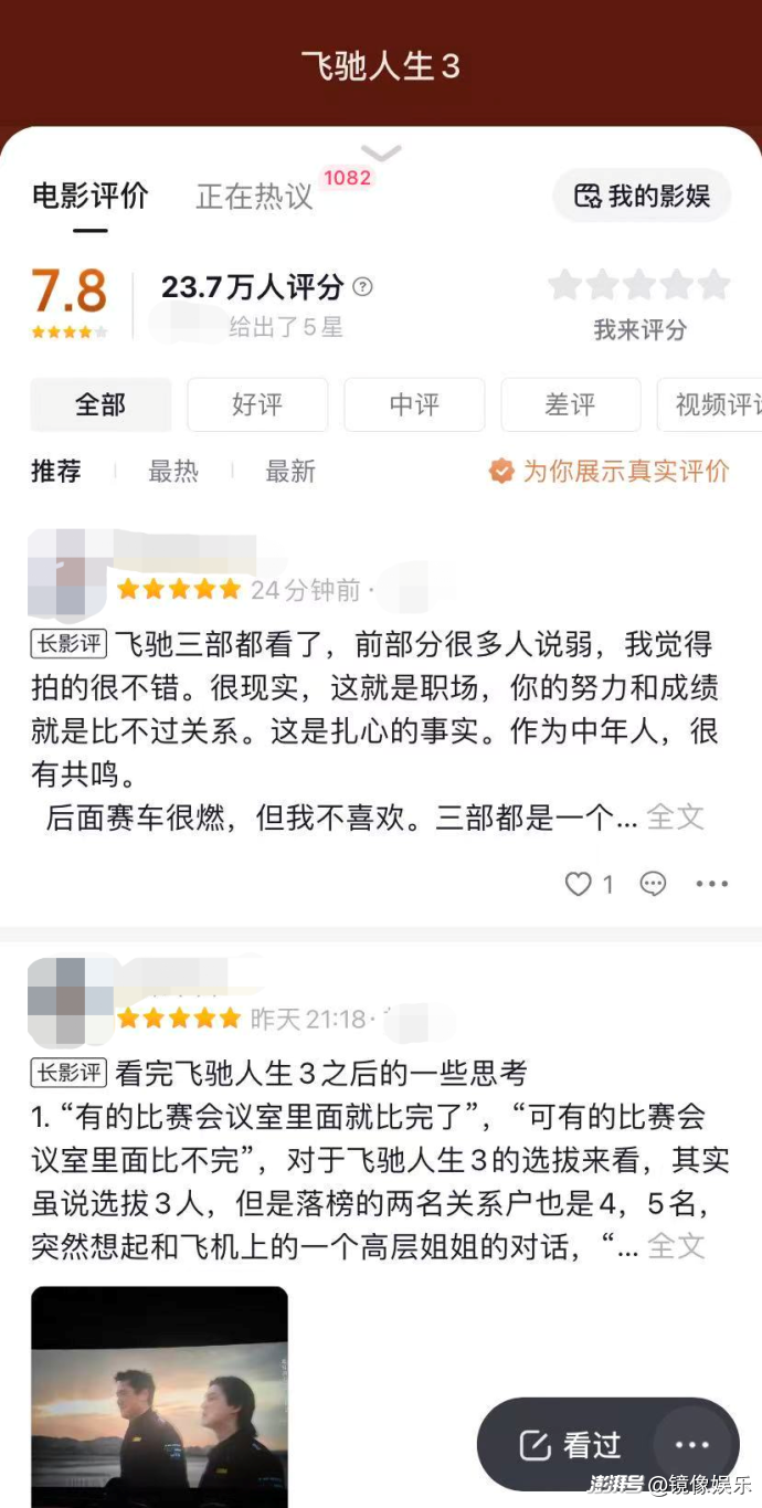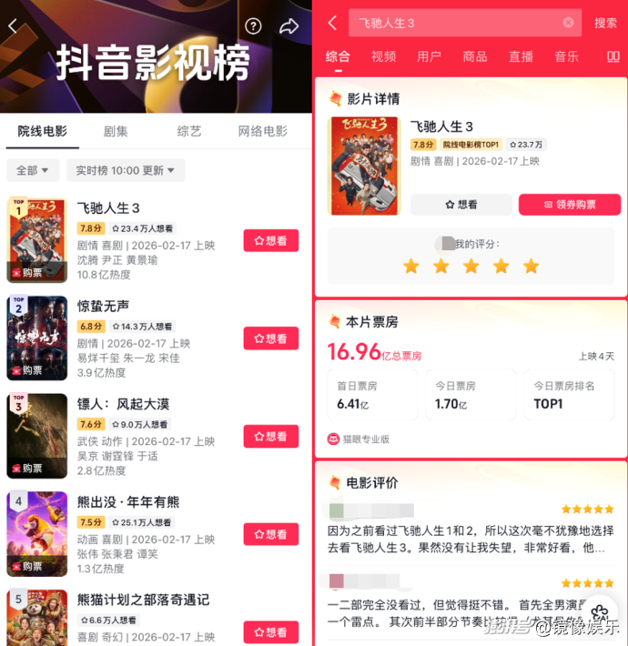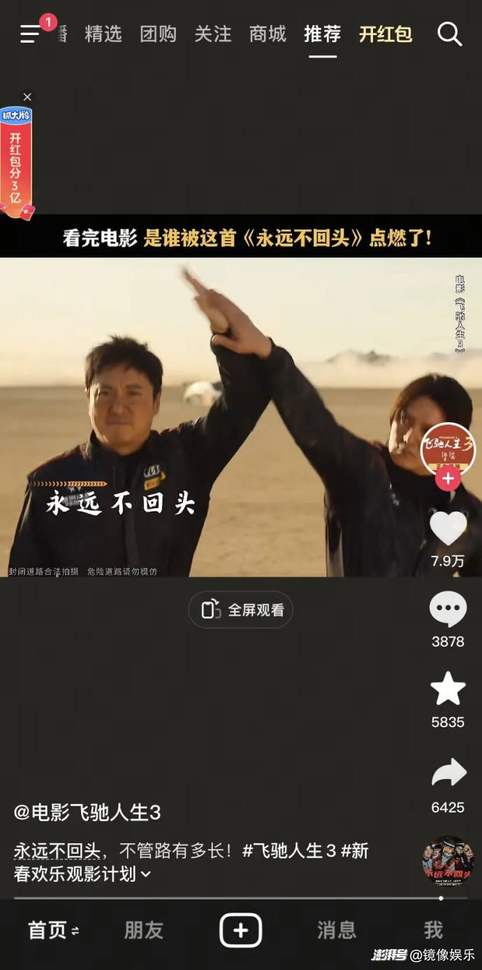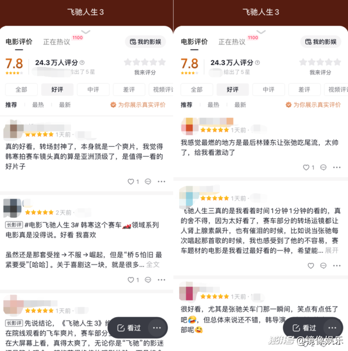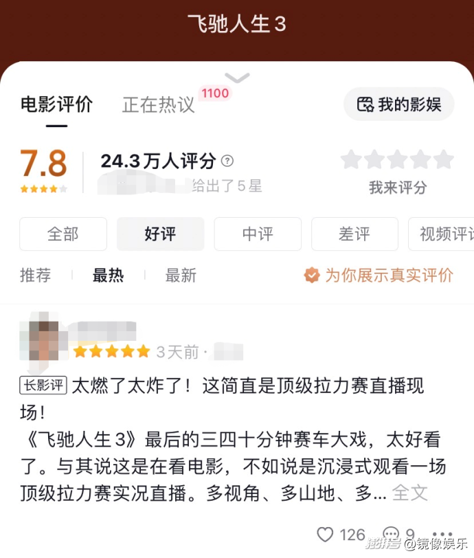 與票房一起領(lǐng)跑的還有口碑。超長篇幅的賽車高燃賽場,配上更成熟的敘事,將#飛馳人生3春節(jié)檔口碑領(lǐng)跑 、#飛馳3沈騰尹正MVP結(jié)算 等話題送上抖音熱搜,引發(fā)大面積討論,24.3萬網(wǎng)友為影片打出7.8的抖音評分,目前在春節(jié)檔新片中位列首位。