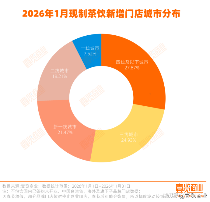 從新增門店的城市分布來看,現(xiàn)制茶飲的門店增長重心持續(xù)下沉,其中四線及以下城市1月新增871家門店,占新增總量的27.87%;三線城市表現(xiàn)同樣突出,新增779家門店,占比24.93%;相較而言,高線城市增長緩慢,一線城市僅新增235家門店,占比最少,為7.52%。