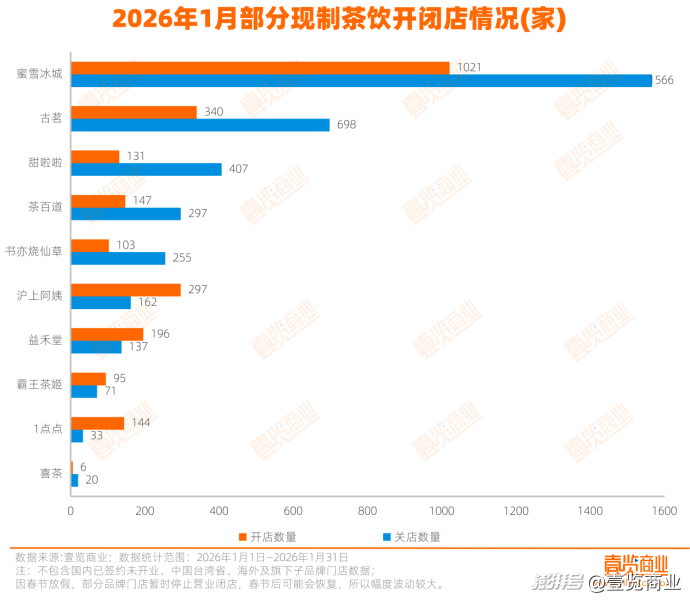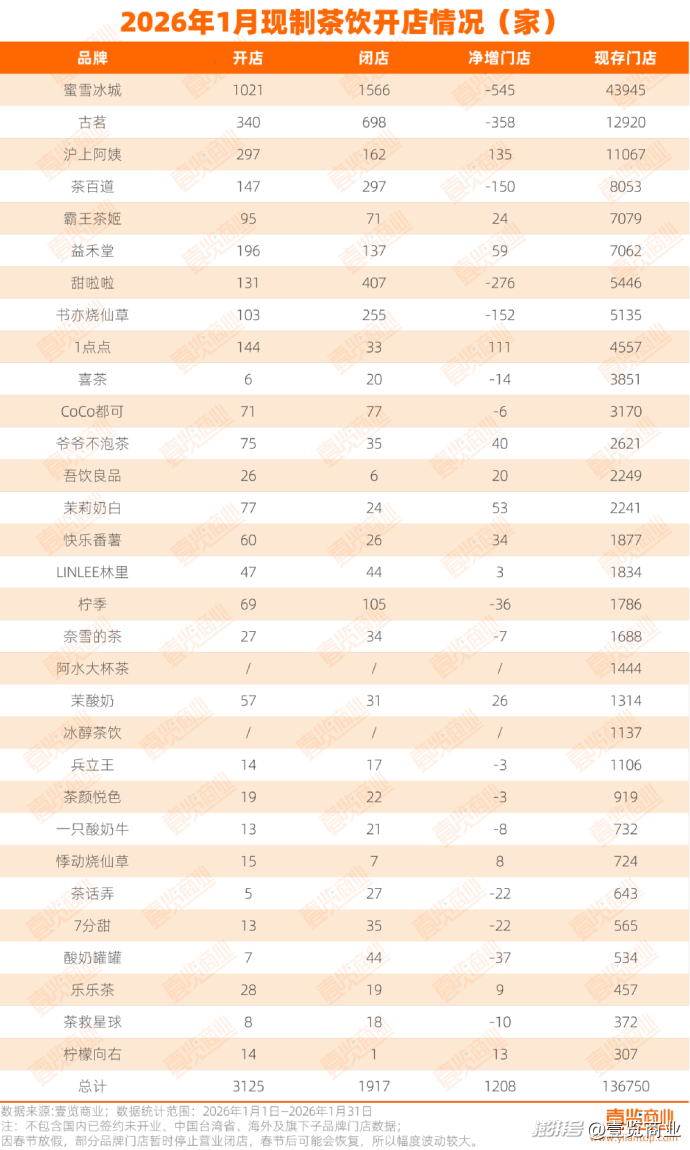 2026年開年,現(xiàn)制茶飲品牌延續(xù)擴(kuò)張態(tài)勢。壹覽商業(yè)數(shù)據(jù)顯示,31個現(xiàn)制茶飲品牌合計(jì)現(xiàn)有門店總量13.68萬家,單月新開3125家、關(guān)閉1917家,凈增長1208家。