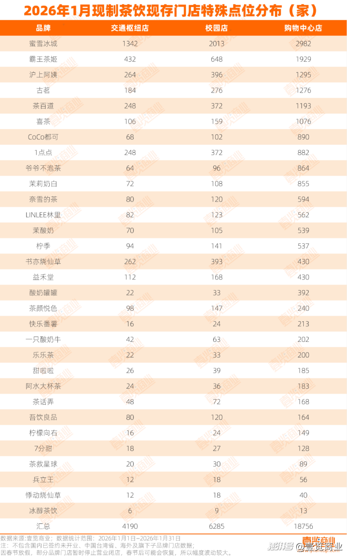 在交通樞紐點(diǎn)位,現(xiàn)制茶飲品牌在此布局的態(tài)度較為審慎,除蜜雪冰城有1342家門店外,僅霸王茶姬、滬上阿姨、古茗、茶百道、喜茶、1點(diǎn)點(diǎn)、書亦燒仙草、益禾堂在此分布超過100家門店。