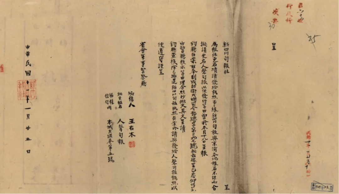 1922年1月25日王右木向四川省會軍事警察廳申請將《新四川旬報》更名為《人聲》旬報的呈文(成都市檔案館館 藏)