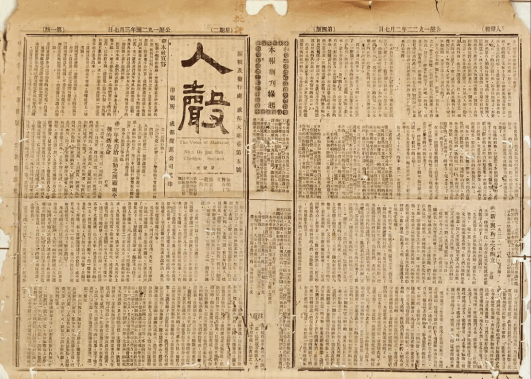 王右木創(chuàng)辦《人聲》報。1921年1月,王右木創(chuàng)辦《新四川旬報》,揭露軍閥壓迫、剝削人民的罪惡行徑,5月便被反動派查封。1922年1月,王右木以報刊名稱與北京、重慶等地報刊重復為由,申請將《新四川旬報》更名為《人聲》旬報,并獲得批準。