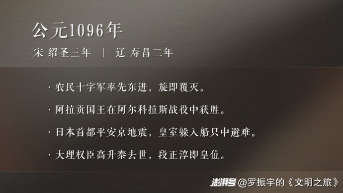 你好,這里是《文明之旅》第三季的第一期。歡迎你穿越到公元 1096 年,大宋紹圣三年,大遼壽昌二年。