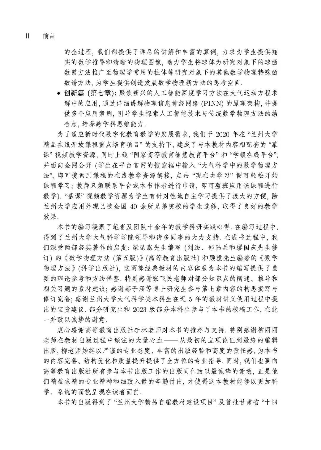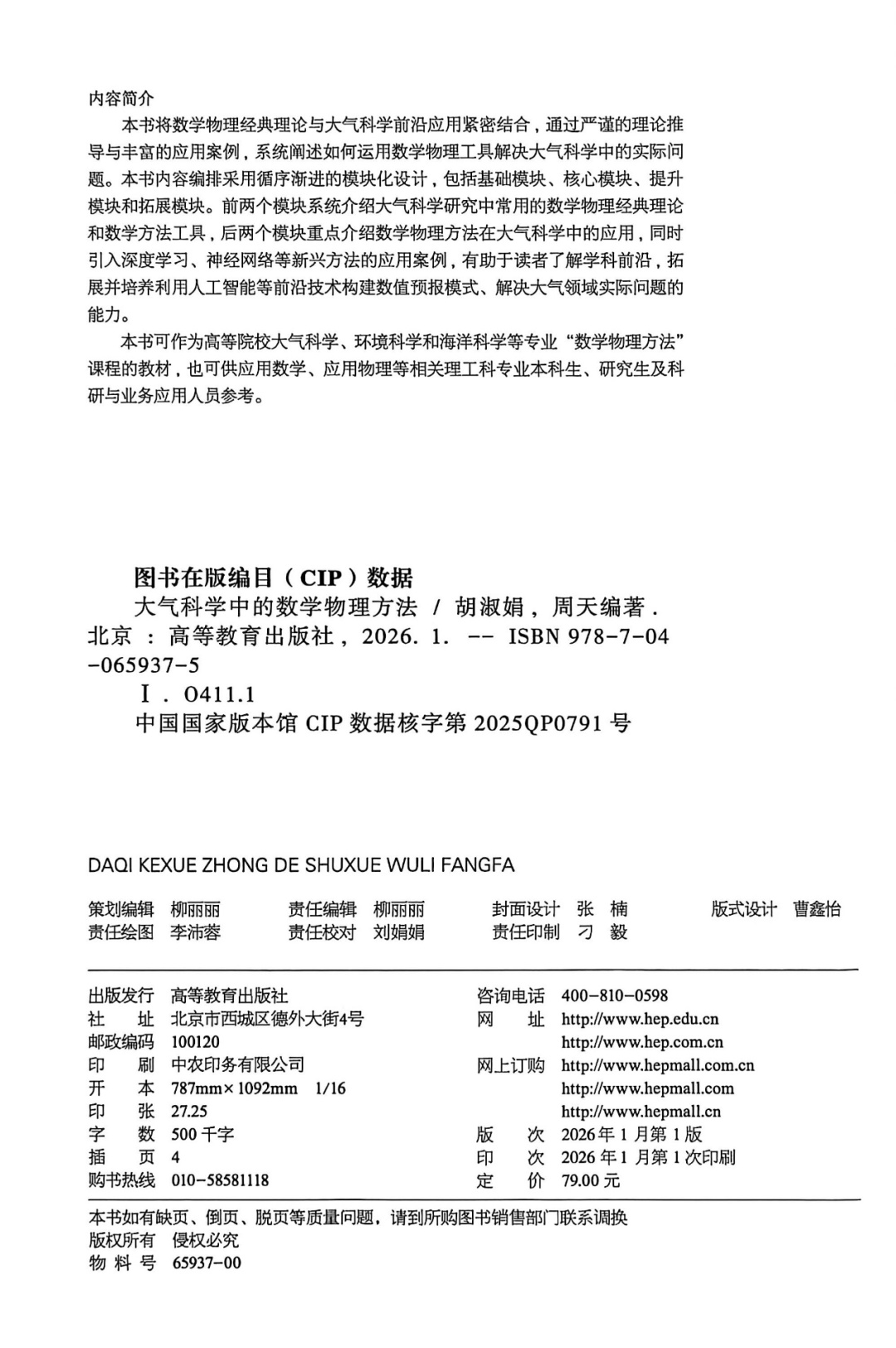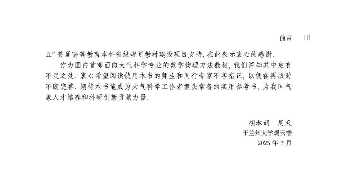 近日,由蘭州大學大氣科學學院胡淑娟教授和周天教授主編、高等教育出版社出版的《大氣科學中的數(shù)學物理方法》正式面向全國公開發(fā)行。這是國內(nèi)首部專為大氣科學專業(yè)量身定制的數(shù)學物理方法教材。該教材的出版,標志著蘭州大學在大氣科學領域的教學研究與課程建設邁上了新的臺階。
