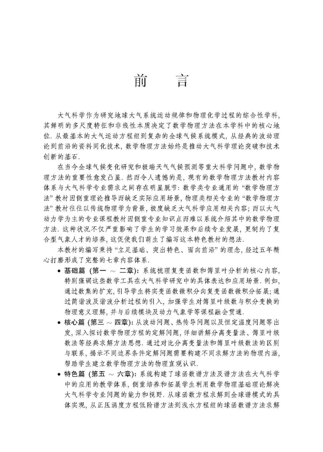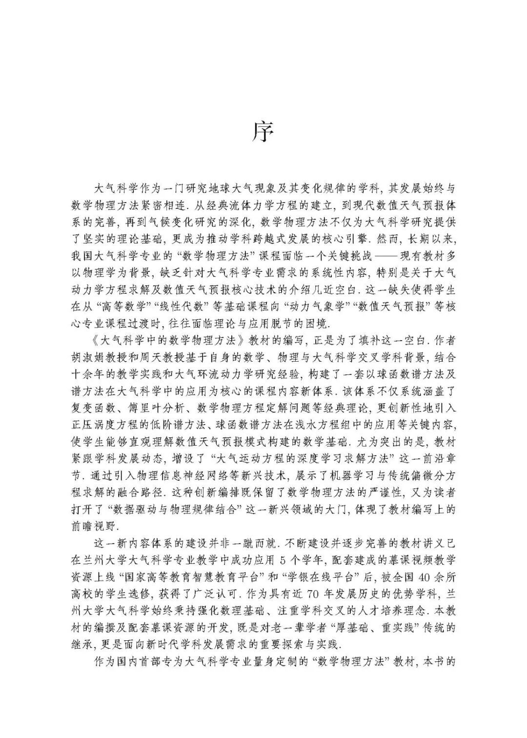 大氣科學固有的非線性本質(zhì)與多尺度特征,決定了數(shù)學物理方法在本學科中的核心地位。從經(jīng)典流體力學方程的建立,到現(xiàn)代數(shù)值天氣預報體系的完善,再到氣候變化研究的持續(xù)深化,大氣科學的每一步進展,都離不開數(shù)學方法的嚴謹推演與物理原理的深刻支撐。然而,長期以來,我國大氣科學專業(yè)的“數(shù)學物理方法”課程面臨一項關鍵挑戰(zhàn):現(xiàn)有教材多以物理學為背景,缺乏針對大氣科學專業(yè)需求的系統(tǒng)性內(nèi)容,導致學生在從基礎理論向專業(yè)課程過渡時,存在理論與應用嚴重脫節(jié),制約了拔尖創(chuàng)新人才的培養(yǎng)。