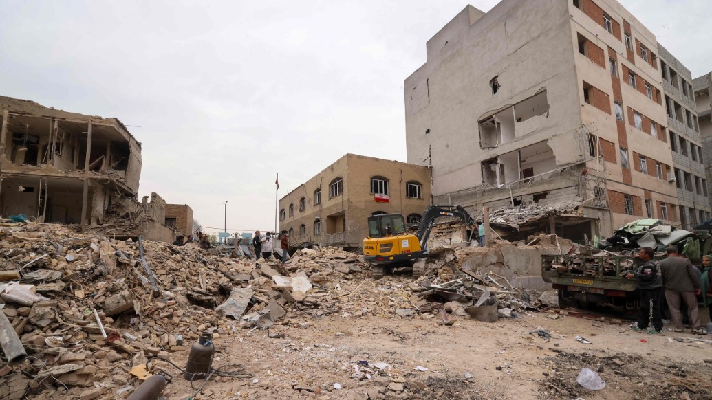 當(dāng)?shù)貢r間2026年3月15日,伊朗德黑蘭,一臺挖掘機(jī)正在清理一處受損居民樓的廢墟。視覺中國 圖