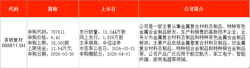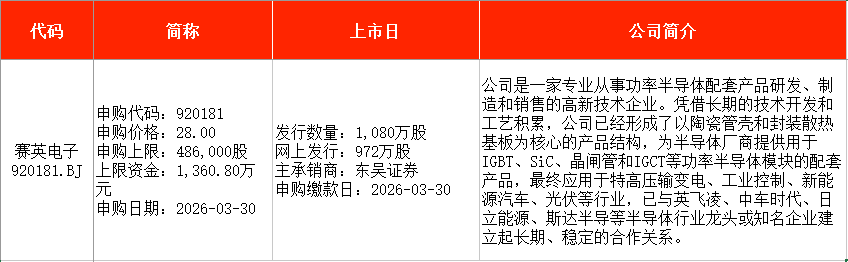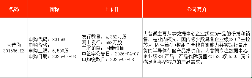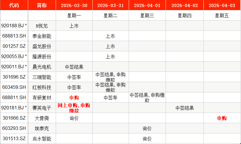 從時間表看,有研復(fù)材(688811)、賽英電子(920181)在本周一(3月30日)申購,大普微(301666)則將在本周五(4月3日)申購。