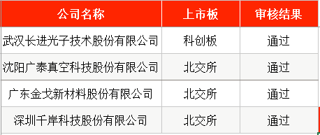其中,擬在科創(chuàng)板IPO的武漢長進光子技術(shù)股份有限公司(下稱“長進光子”),以及擬在北交所IPO的沈陽廣泰真空科技股份有限公司(下稱“廣泰真空”)、廣東金戈新材料股份有限公司(下稱“金戈新材”)、深圳千岸科技股份有限公司(下稱“千岸科技”)等均成功過會。