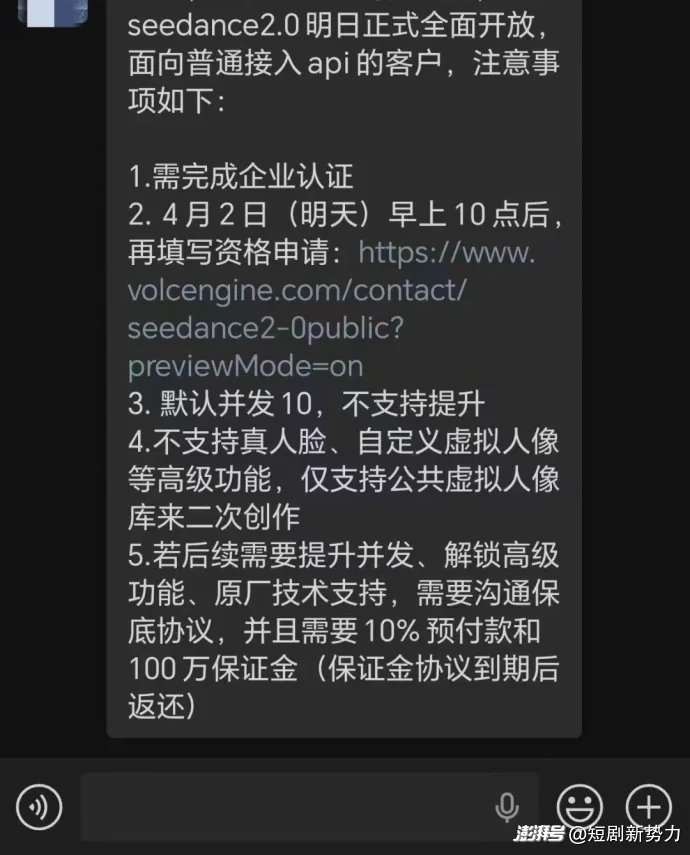 4月2日,字節(jié)跳動旗下火山引擎Seedance 2.0啟動面向普通API客戶的開放申請,行業(yè)等待已久的AI生成視頻能力進一步放開。本次開放并非無限制接入,而是設置了明確準入條件與使用邊界,既回應市場需求,也延續(xù)平臺風險管控思路,直接影響中小團隊接入、創(chuàng)作方向與行業(yè)生態(tài)。