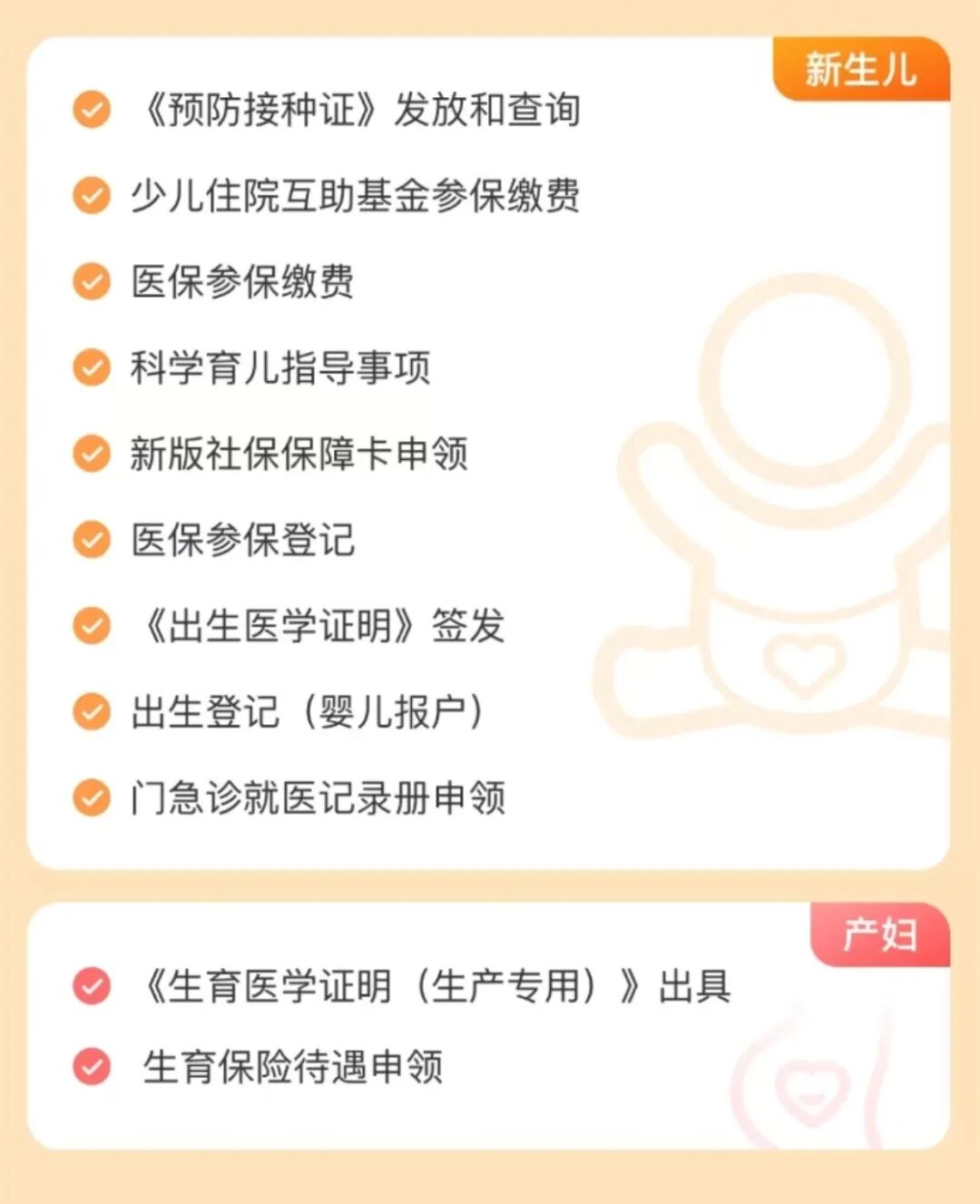 新生兒出生后,家長可通過“隨申辦市民云”“出生‘一件事’”聯(lián)辦服務(wù)一次性辦理出生登記、居保參保繳費、生育津貼申領(lǐng)等11項事務(wù),實現(xiàn)多部門多事務(wù)一次性辦理,免去多地多次奔波,為新手爸媽節(jié)省大量時間和精力。