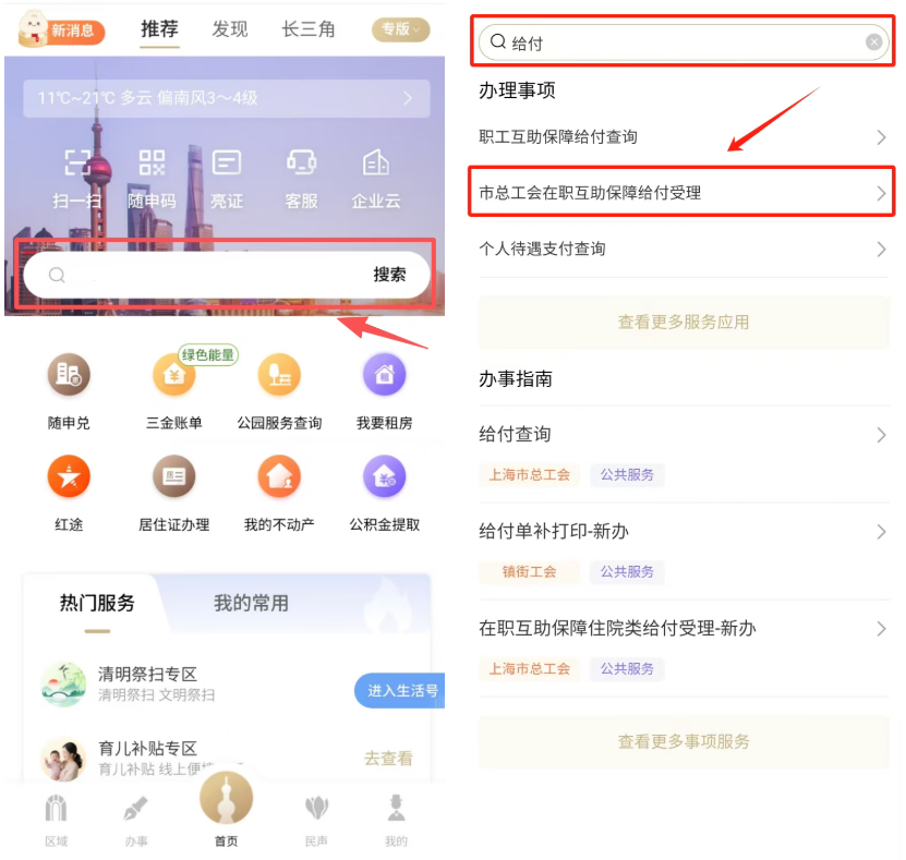 線上申請:參加會員“隨申辦市民云”APP,首頁搜索關(guān)鍵詞“給付”,點擊進入“市總工會在職互助保障給付受理”服務(wù),線上辦理給付申請(參加會員的意外身故保障金、疾病身故保障金和會員未滿16周歲子女重大疾病、身故慰問金除外)。