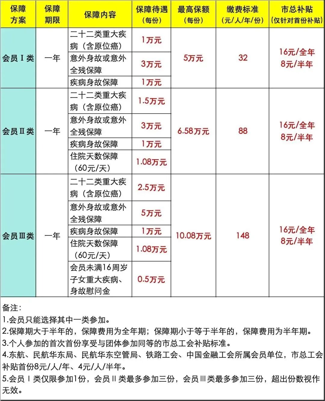 會員保障分會員Ⅰ類、會員Ⅱ類、會員Ⅲ類三個層級。團體參加或個人參加會員保障的會員,根據(jù)所屬單位工會安排和自身實際,選擇其中一類參加。一個保障期限內(nèi),工會會員只能參加一次,會員Ⅰ類、會員Ⅱ類、會員Ⅲ類保障只能選擇其中一類參保;會員Ⅰ類僅限參加1份,會員Ⅱ類最多參加3份,會員Ⅲ類最多參加3份,超出份數(shù)視作無效。
