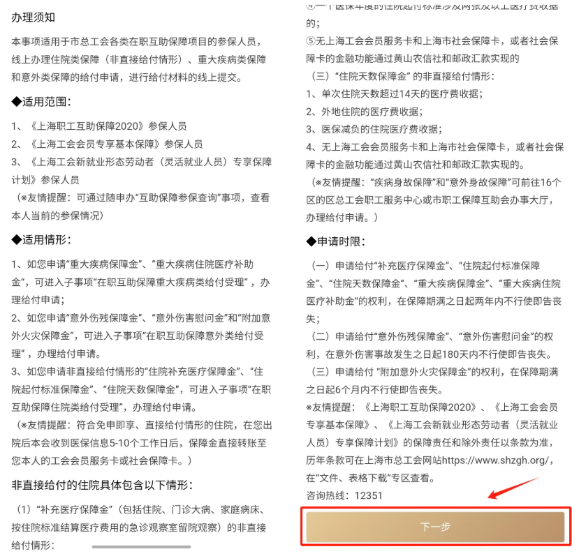 閱讀辦理須知后,點擊“下一步”,選擇對應(yīng)的情形進行給付申請。
