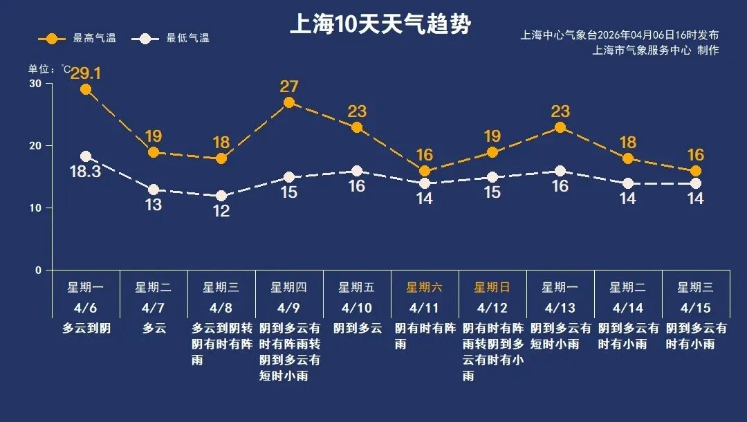 清明假期最后一天,陽光露臉,氣溫飆升,市區(qū)徐家匯站最高氣溫升至29.1℃,“熱度”超標(biāo),體驗(yàn)初夏體感。受弱冷空氣影響,下午風(fēng)力逐漸加大,晚間北到東北風(fēng)4~5級陣風(fēng)6級,沿江沿海地區(qū)有5級陣風(fēng)6~7級,加上氣溫下降明顯,大家注意及時(shí)調(diào)整著裝。
