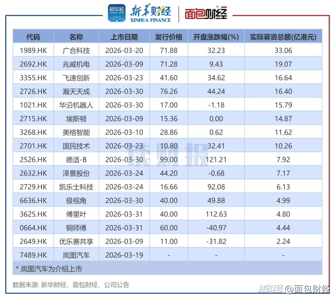 3月上市新股中,廣合科技募資總額達33.06億港元,規(guī)模最大。兆威機電、飛速創(chuàng)新、瀚天天成、華沿機器人募資超過15億港元。