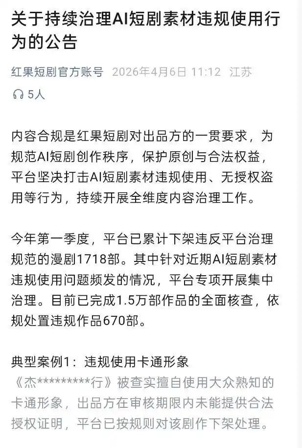 4月6日,紅果短劇發(fā)布《關(guān)于持續(xù)治理AI短劇素材違規(guī)使用行為的公告》。