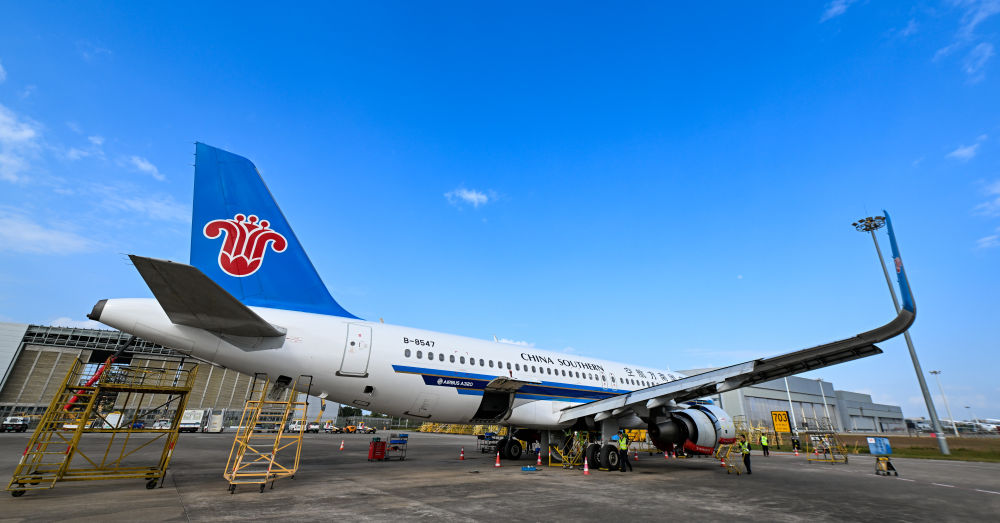 1月29日,??诿捞m國際機場停機坪上,南航工程技術分公司機務工程師在對飛機進行深度檢查。新華社記者 楊冠宇 攝