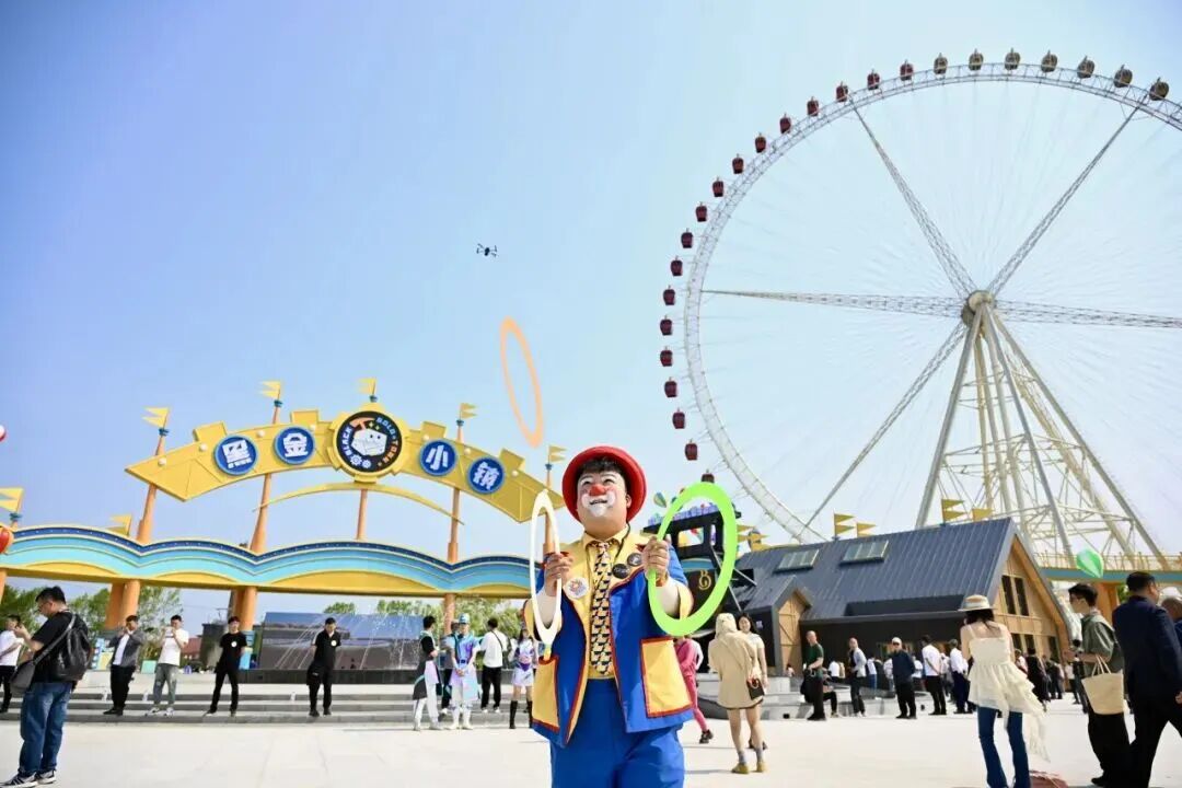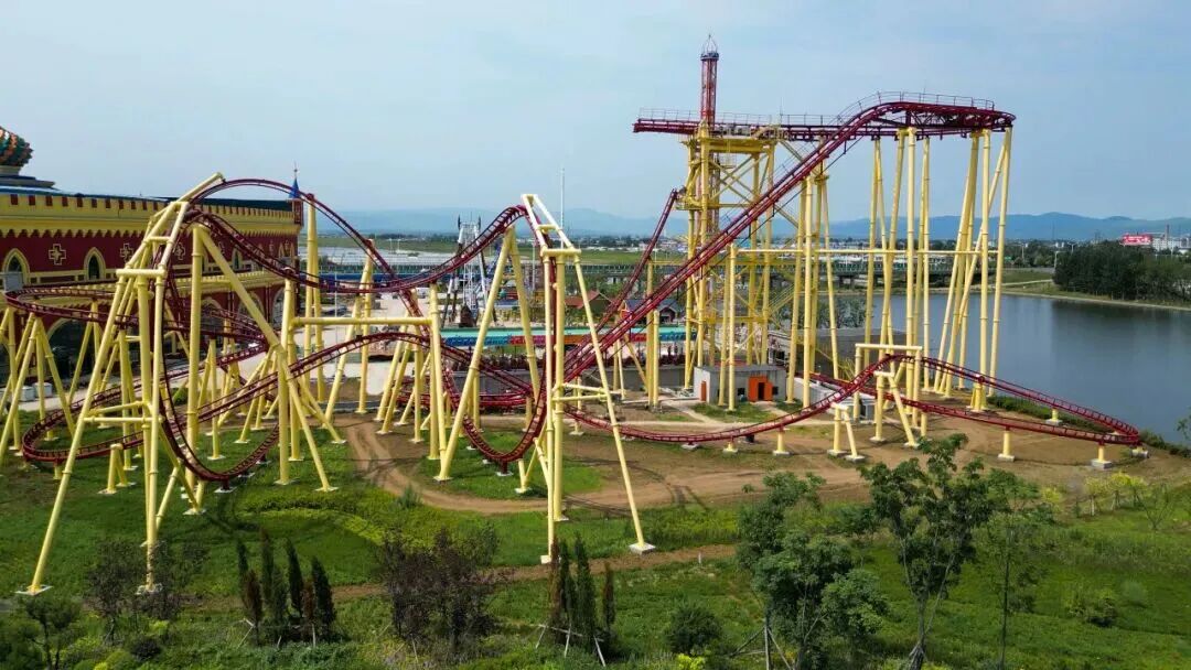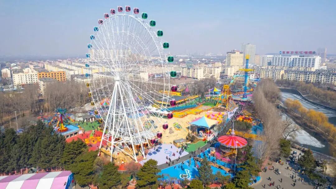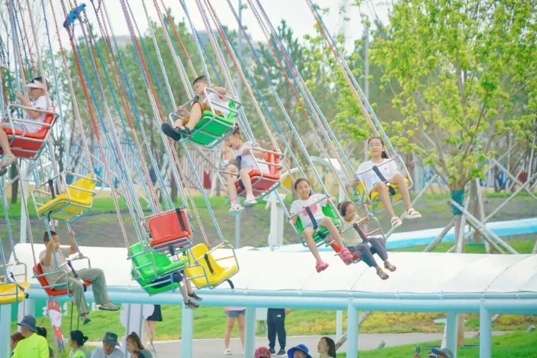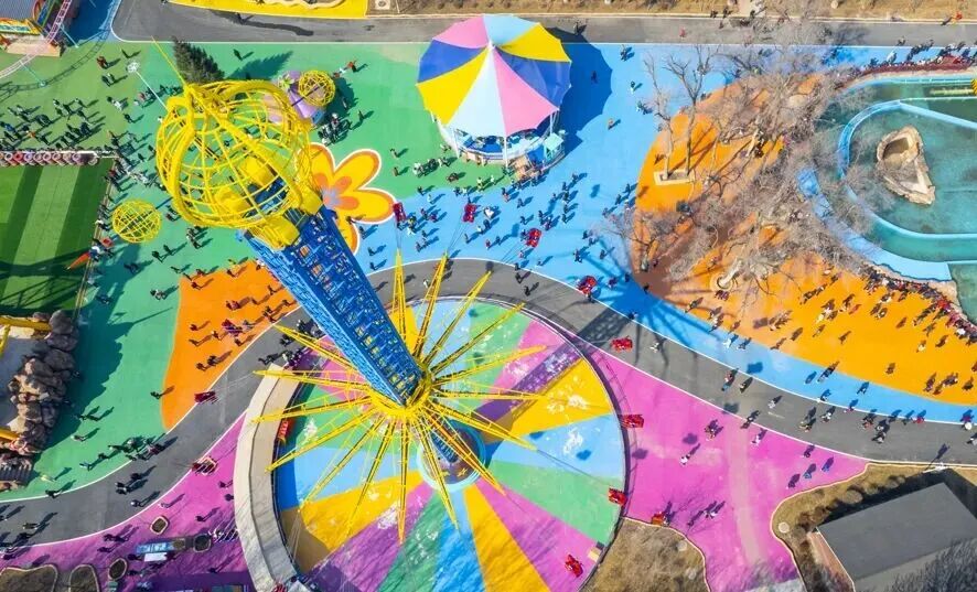 中心廣場(chǎng)的大型彩虹滑道前,五彩滑道與春日藍(lán)天相映成趣。尖叫游園區(qū)內(nèi),96人大型海盜船、超燃大擺錘……讓你盡情釋放壓力;80米高的巨型摩天輪可俯瞰園區(qū)全景與江北風(fēng)光。