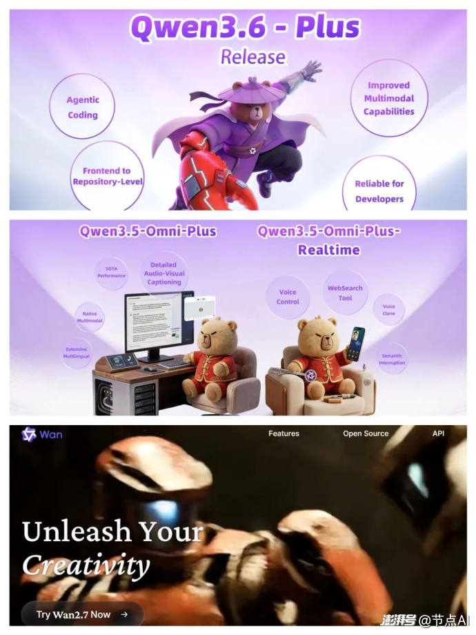 《節(jié)點AI》發(fā)現(xiàn),就在這兩次變陣之間,通義實驗室在四天內(nèi)密集發(fā)布了三款旗艦?zāi)P停篞wen3.5-Omni全模態(tài)交互模型、Wan2.7-Image視覺生成模型、Qwen3.6-Plus大語言模型,覆蓋全模態(tài)理解、圖像生成與編程智能體三大關(guān)鍵能力區(qū)間。