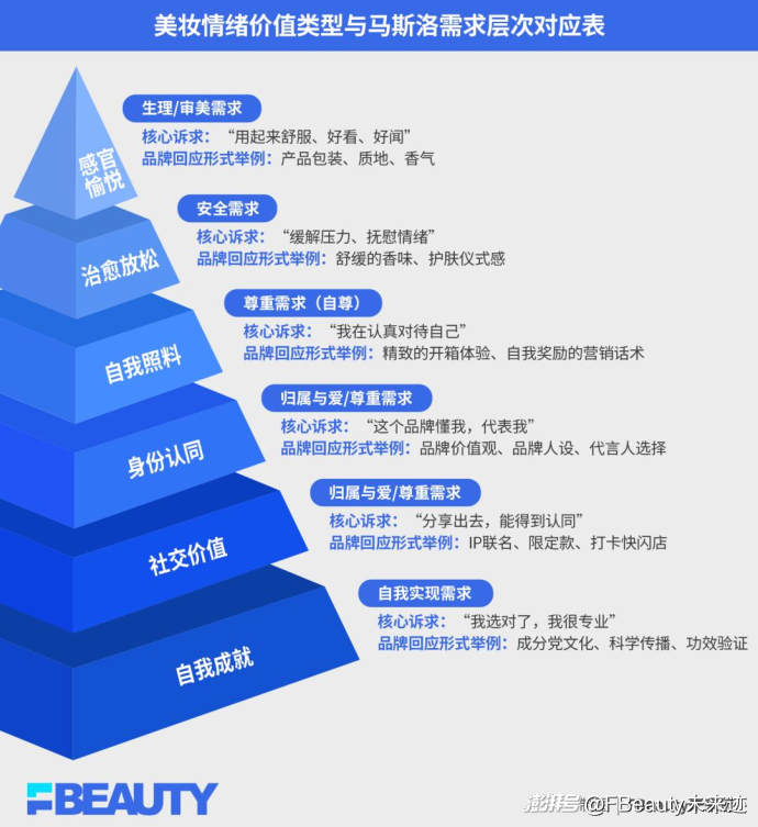 參照馬斯洛需求層次理論,可以將美妝消費(fèi)中的核心情緒類型歸納為六個層次,從基礎(chǔ)到高階依次為: