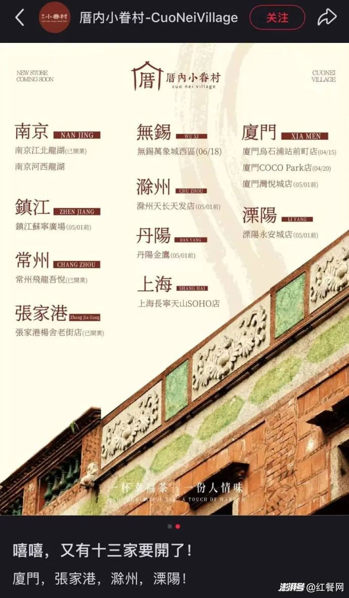 其官方小紅書賬號(hào)顯示,2025年底至今,小眷村已在無(wú)錫、常州、杭州、南京、上海、蘇州等江浙滬城市新開出10余家門店,今年5月前廈門還將再增3家,泉州、深圳、武漢、成都等城市也正在同步招募合作伙伴。