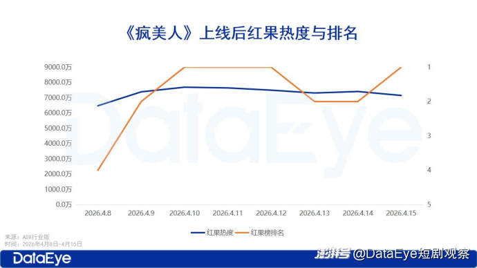 4月6日,《瘋美人》上線抖音端原生,次日登上DataEye抖音端原生熱播榜,位列第6。截至4月15日,抖音端累計播放量達(dá)1.5億。