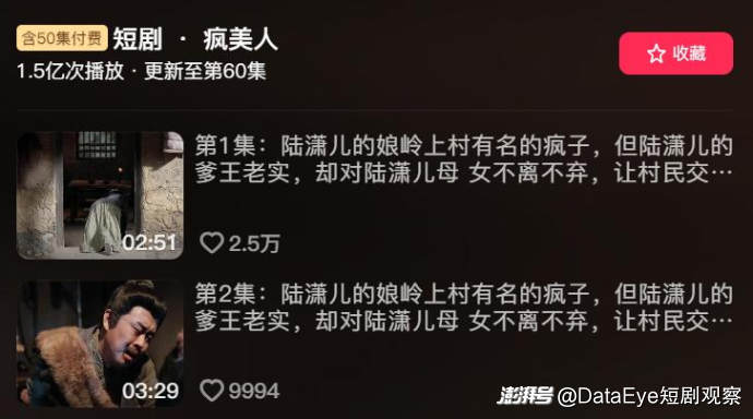 DataEye研究院觀察到,上周末,《瘋美人》連續(xù)3期登頂DataEye紅果熱榜,收藏量破120W。