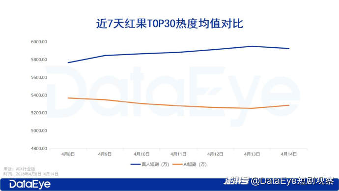 從近半個月的紅果均值熱度對比來看,目前,真人短劇增長態(tài)勢穩(wěn)定,AI短劇也在逐步占領(lǐng)市場份額。
