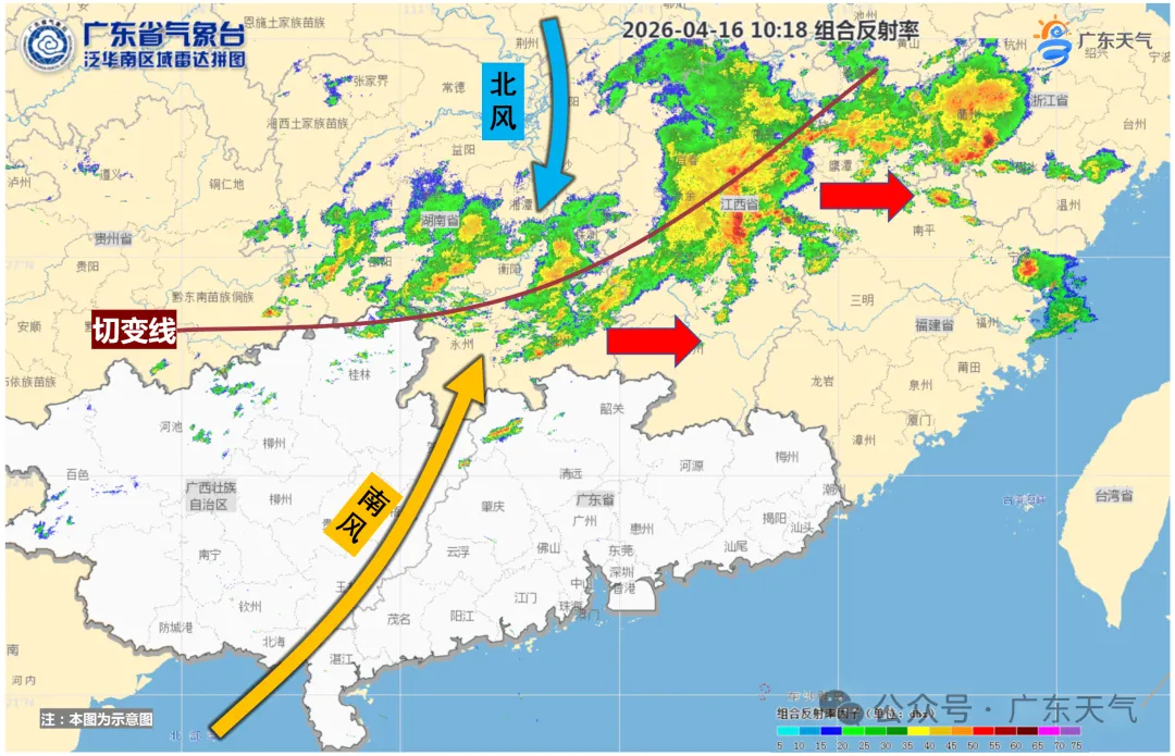今天(4月16日)上午,從天氣雷達(dá)圖可見(jiàn),冷暖氣流在江南一帶交匯,產(chǎn)生線狀對(duì)流云團(tuán)并隨著高空波動(dòng)逐漸東移,韶關(guān)、清遠(yuǎn)也有分散雷雨云團(tuán)出沒(méi)。