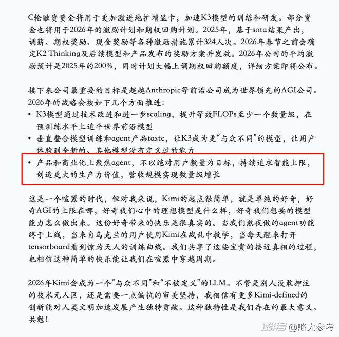 在2025年底的那封內(nèi)部信里,楊植麟把“超越 Anthropic、成為世界領(lǐng)先的AGI公司”寫成最重要目標(biāo),又強(qiáng)調(diào)“不以絕對用戶數(shù)量為目標(biāo),持續(xù)追求智能上限”,甚至明確提到“需要一點(diǎn)偏執(zhí)的審美堅(jiān)持”。