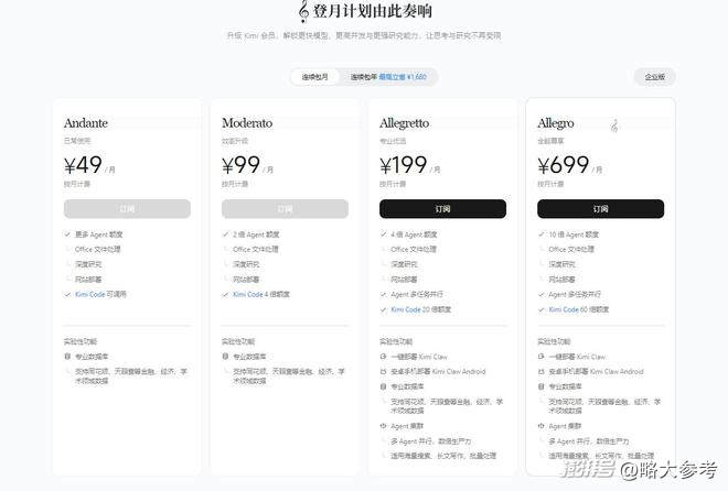 Kimi也把錢從API挪到“我替你動(dòng)用了多少工具、占用了多少環(huán)境、持續(xù)運(yùn)行了多久”上:Kimi web search每次調(diào)用收費(fèi)0.005美元,搜索結(jié)果token還會繼續(xù)計(jì)費(fèi);Kimi Claw的一鍵云部署則需要Allegretto(每月$31)或更高會員。