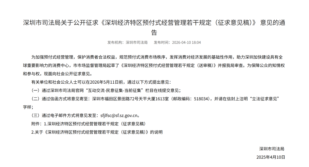 目前,《規(guī)定》正通過深圳市司法局官網(wǎng)等渠道公開征求意見,公眾可在2026年5月11日前,通過深圳市司法局官網(wǎng)“互動交流-民意征集-當(dāng)前征集”欄目在線提交意見,或通過電子郵件方式將意見發(fā)至:sfjlfsc@sf.sz.gov.cn。