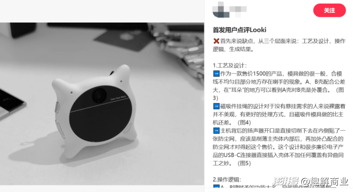 經(jīng)常有網(wǎng)友提到,花上千塊錢(qián)買(mǎi)一個(gè)AI硬件,戴了一整天,晚上打開(kāi)APP看分析報(bào)告,看到一半蹦出來(lái)一個(gè)付費(fèi)開(kāi)通會(huì)員的提示,最后硬件沒(méi)用幾天就“吃灰”了。也有深度體驗(yàn)Looki的用戶表示,Looki宣稱能根據(jù)攝像頭監(jiān)測(cè)到的用戶的舉動(dòng)和環(huán)境,推送相應(yīng)的提示,但它推送的內(nèi)容實(shí)用性非常弱,并不了解我需要什么,而是只管它看到了什么,“有點(diǎn)像一個(gè)愛(ài)尬聊的朋友”。