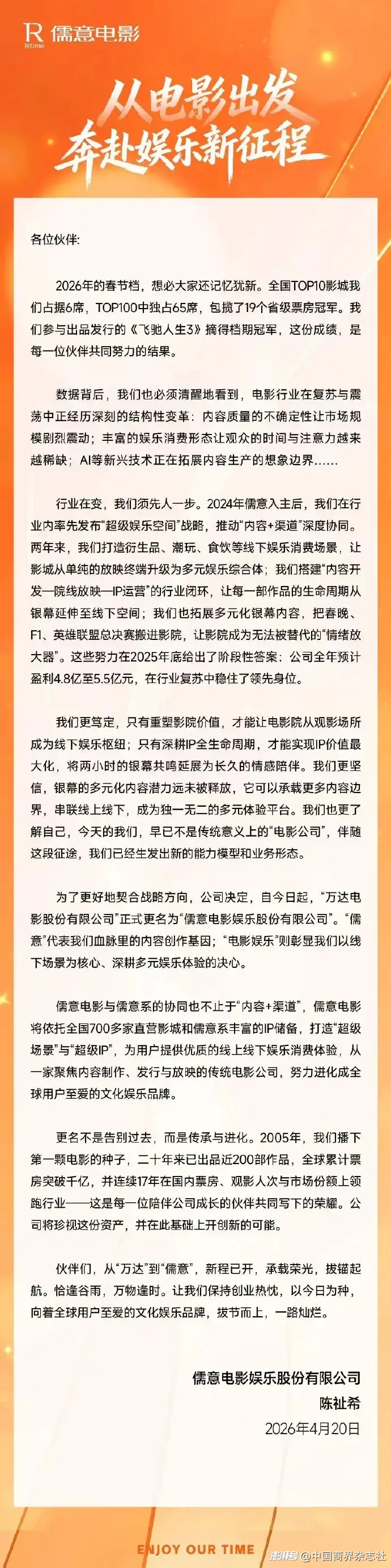4月20日,在萬達電影正式更名為“儒意電影娛樂股份有限公司”之后,儒意電影董事長兼總裁陳祉希發(fā)布了一封全員信。陳祉希在這封信中提到,公司更名成儒意電影,是為了更好地契合戰(zhàn)略發(fā)展方向,“儒意”代表血脈里的內(nèi)容創(chuàng)作基因;“電影娛樂”彰顯以線下場景為核心、深耕多元娛樂體驗的決心。