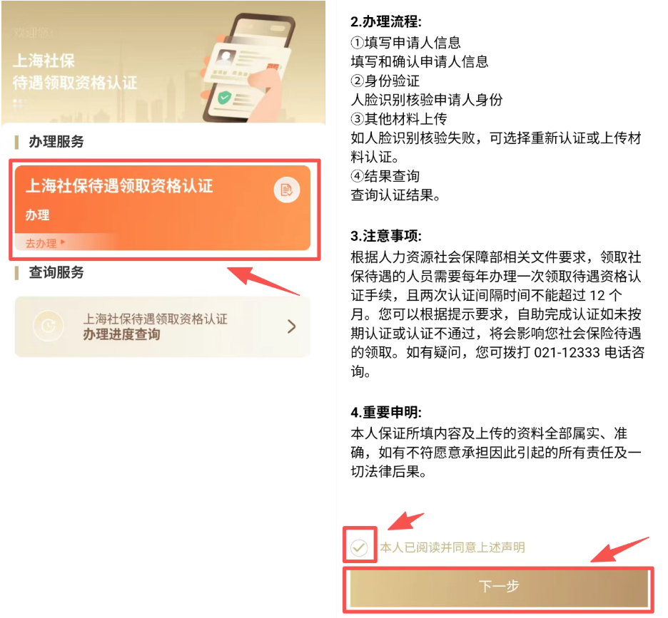 1、點(diǎn)擊“上海社保待遇領(lǐng)取資格認(rèn)證辦理”,進(jìn)入認(rèn)證流程。認(rèn)真閱讀辦理流程、注意事項和重要申明后,勾選“本人已閱讀并同意上述聲明”,并點(diǎn)擊“下一步”。