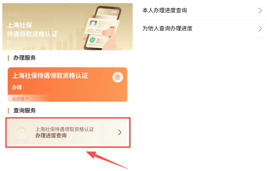 點(diǎn)擊“上海社保待遇領(lǐng)取資格認(rèn)證辦理進(jìn)度查詢”,選擇對應(yīng)的查詢類型(可以本人查詢,也可為他人查詢)。