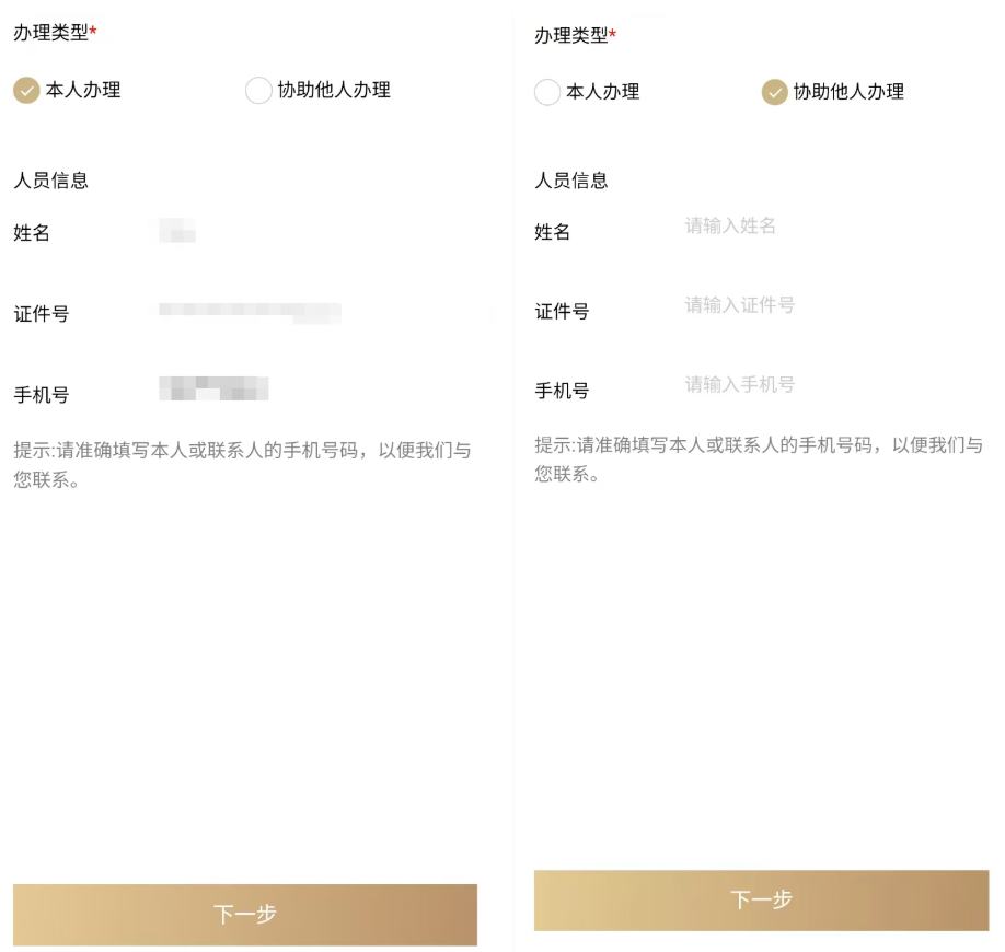 ②如需協(xié)助家人或朋友辦理,辦理類型請選擇“協(xié)助他人辦理”,準(zhǔn)確錄入他人的姓名、證件號和手機(jī)號碼后,點(diǎn)擊“下一步”。