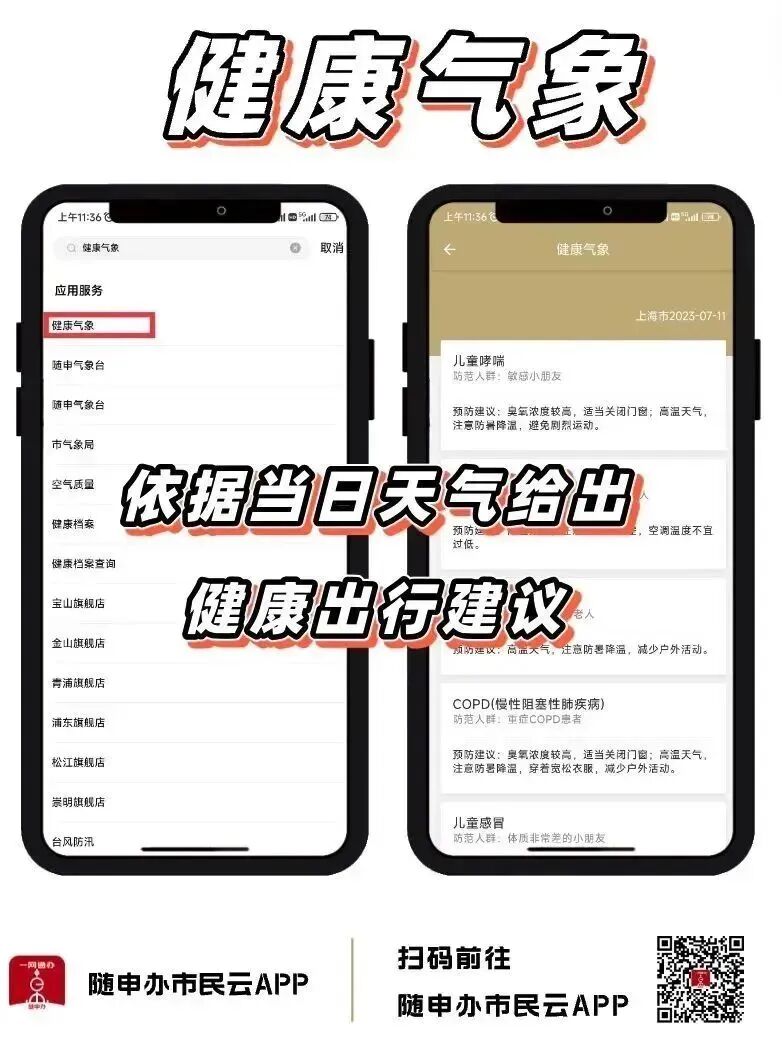 “隨申辦市民云”APP【健康氣象】服務(wù),根據(jù)每日不同天氣情況針對(duì)不同人群,給出合適的出行意見(jiàn)。
