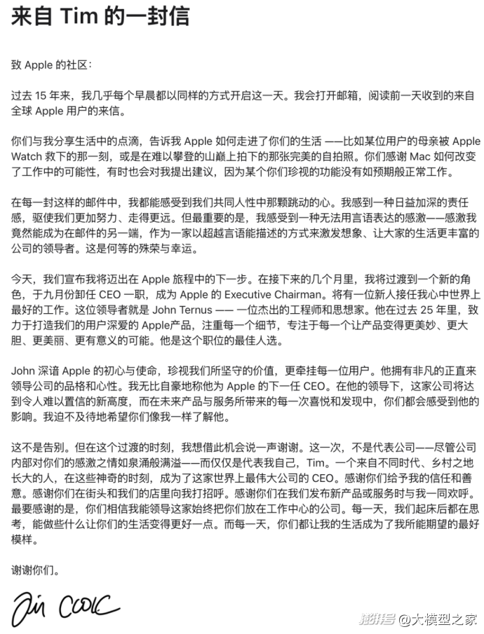 庫克在當天的公開信中充滿深情地寫道,自己是從一個偏遠小鎮(zhèn)走出來的普通人,有幸執(zhí)掌這家公司。但字里行間,我們也讀出了一種“扶上馬,送一程”的冷靜與從容。