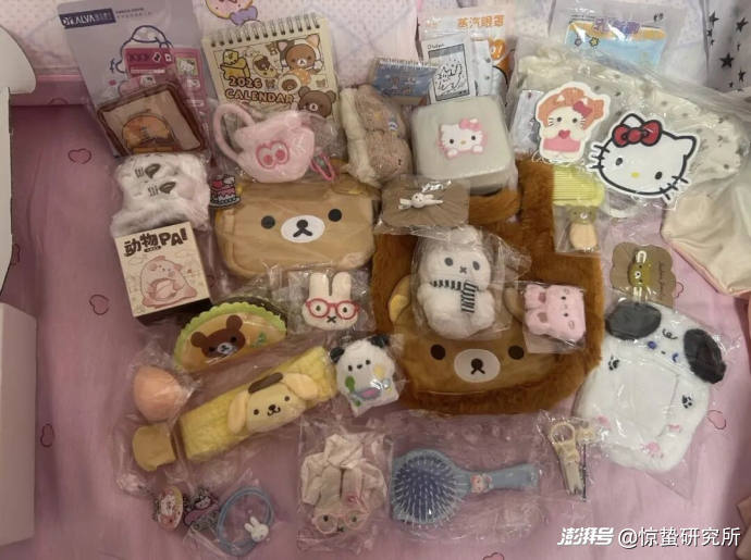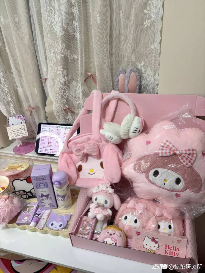 洛西則是Hello Kitty的愛好者。過年那會兒,她在一家盲勺店里下單,雖然每勺要168元,她還是買了兩勺,收到了Hello Kitty的杯子、收納包、毛絨掛件等,送的3個扭蛋中,有一個還扭到了一件印有粉色小熊的毛衣。