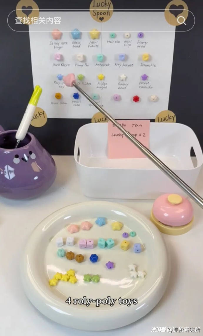 2025年7月,ReRe Gift發(fā)布了第一條盲勺視頻。視頻里,她拿著一把瓷勺,從裝滿一堆五顏六色塑料珠子的容器里隨意一舀,倒在盤中,接著根據(jù)珠子的顏色和數(shù)量,從貨架上逐一找出有著粉嫩可愛外觀的毛絨娃娃、卡通便利貼、收納包……一件件放入打包紙盒。