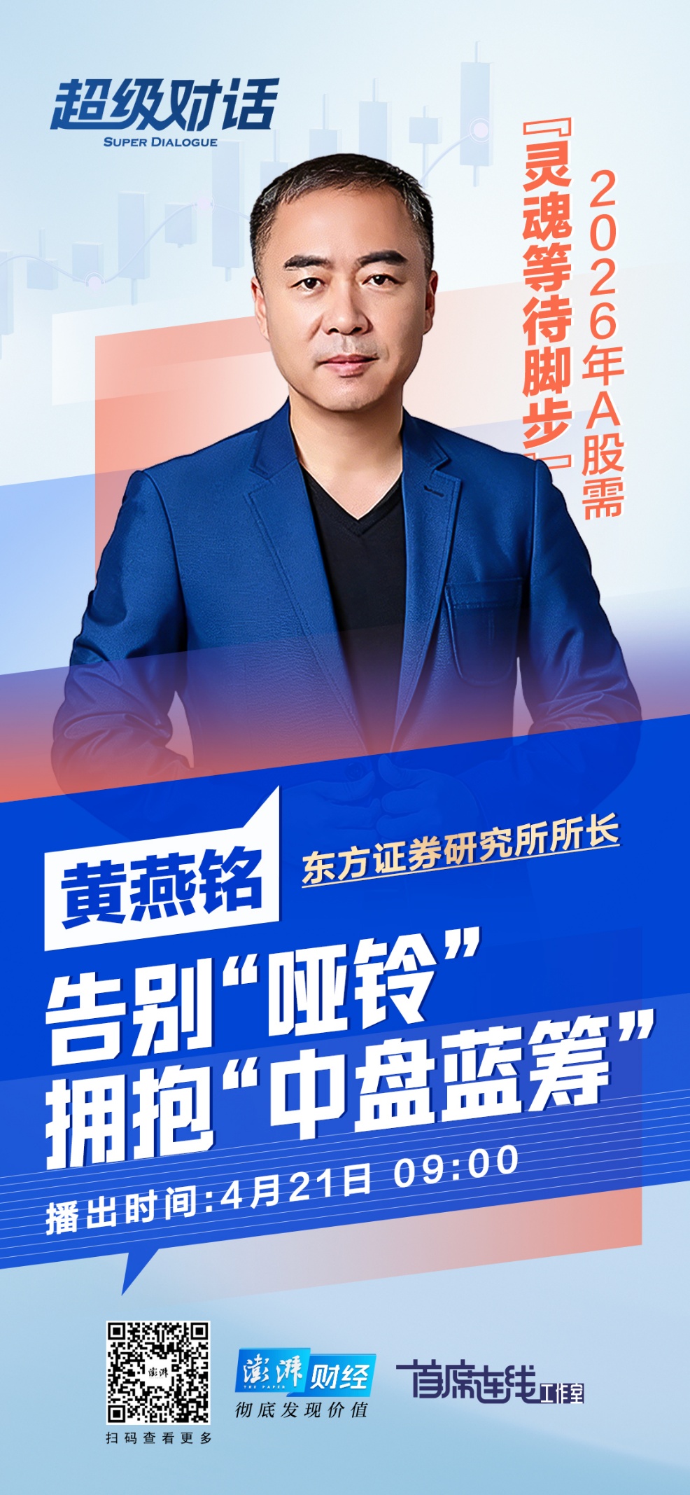 “2026年,A股需‘靈魂等待腳步’,告別‘啞鈴’擁抱‘中盤藍(lán)籌’。”4月21日,東方證券研究所所長(zhǎng)黃燕銘在做客澎湃新聞《超級(jí)對(duì)話》節(jié)目中如是說。