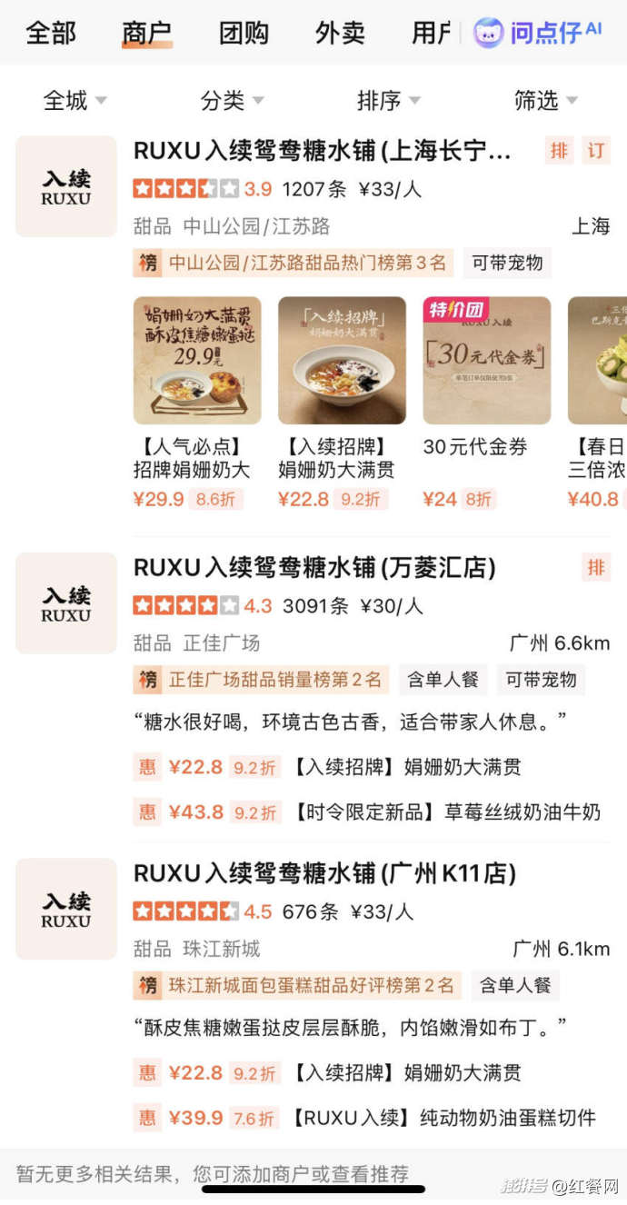 茶理宜世則推出了副牌“RUXU入續(xù)鴛鴦糖水鋪”,從模式上看,其跨界布局糖水賽道會更加深入。據了解,RUXU入續(xù)鴛鴦糖水鋪自2023年成立以來,已經在廣州、深圳、上海、成都等一線、新一城城市開出超20家門店。大眾點評顯示,其多個城市門店均位于所在商圈相關美食榜前3名。