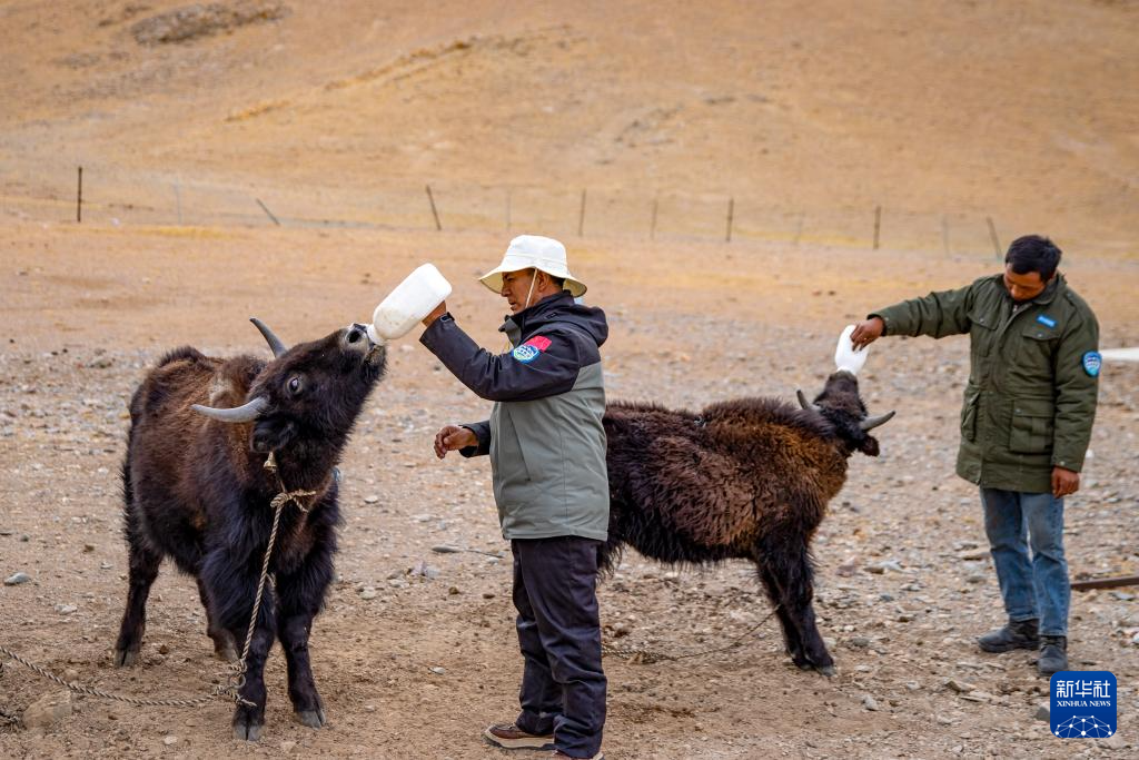 4月8日,羌塘國家級(jí)自然保護(hù)區(qū)那曲地區(qū)管理局野生動(dòng)物專業(yè)管護(hù)員羅布(左)和同事在給收養(yǎng)的小野牦牛喂奶。新華社記者 姜帆 攝
