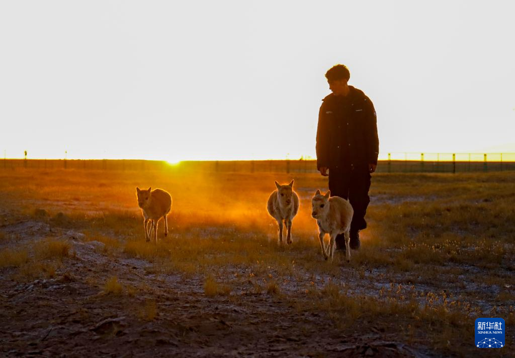 2025年8月27日拍攝的羌塘國家級(jí)自然保護(hù)區(qū)那曲地區(qū)管理局尼瑪縣瑪依管護(hù)站野生動(dòng)物專業(yè)管護(hù)隊(duì)員羅布與站里收養(yǎng)的藏羚羊幼崽。新華社發(fā)