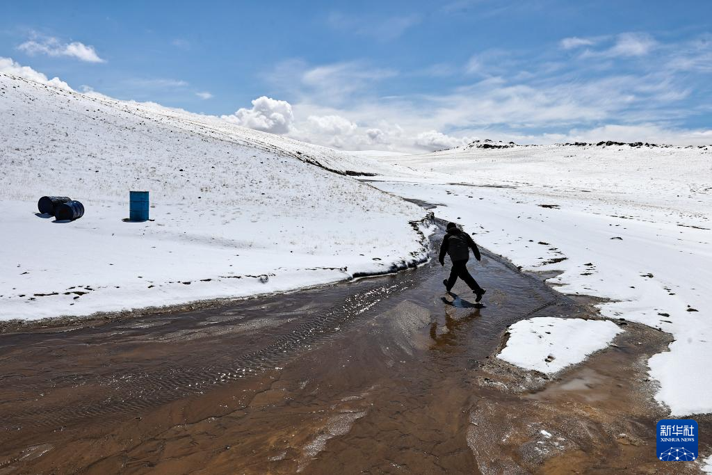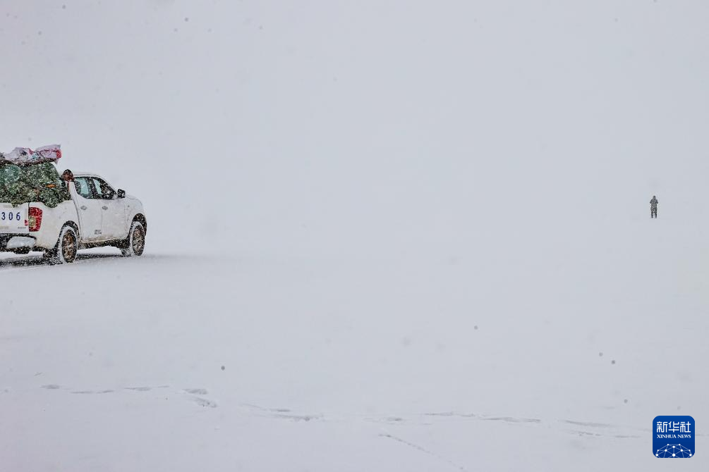4月9日,在巡護(hù)途中遇到暴雪,羌塘國家級(jí)自然保護(hù)區(qū)那曲地區(qū)管理局野生動(dòng)物專業(yè)管護(hù)員格桑倫珠徒步為車隊(duì)勘察安全線路。新華社記者 姜帆 攝