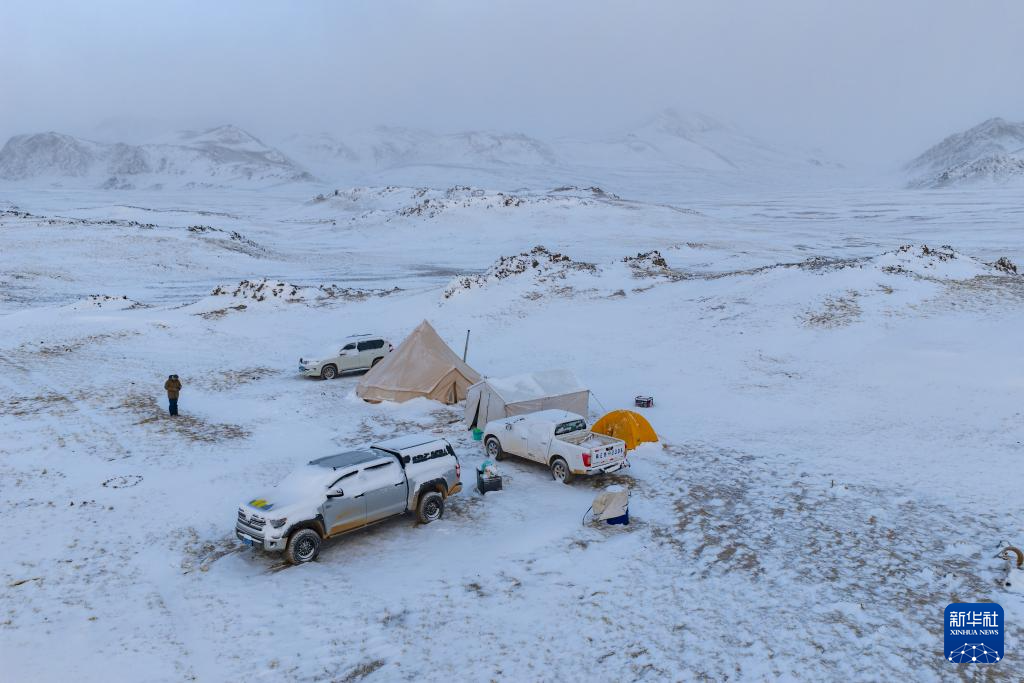 4月11日,羌塘國家級(jí)自然保護(hù)區(qū)那曲地區(qū)管理局的巡護(hù)隊(duì)伍在“巴毛窮宗”地區(qū)雪中宿營(無人機(jī)照片)。新華社記者 姜帆 攝